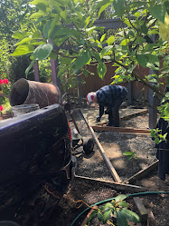 Back in February we dug up the cherry tree in the back apple orchard and switched it with the Honeycrisp Apple tree by the cement patio at the side of the house. It took all day for Stephen to dig around the large cherry tree and all of us helped to pull it out and drag it over to the place where he dug out the apple tree which was much smaller.